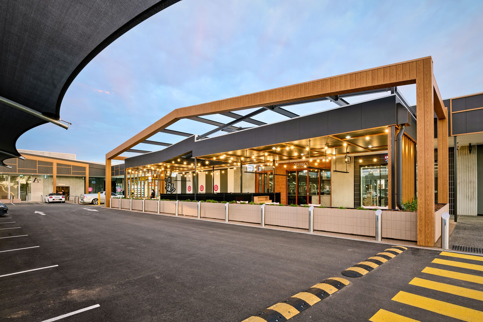 The development includes Direct to boot, loading docks/compactors, alfresco eating areas, playground, and external covered walkways, featuring precast planters and seating, along with native landscaping. External carparking with shade sails and pad sites ready for development by others.